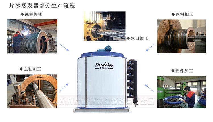 片冰機蒸發器作為片冰機蒸發產冰的組件,是機器產能及產冰質量最重要的部件。森德制冰具備多年的片冰機設計和生產制造經驗,根據客戶的用冰需求,我工廠可單獨代工蒸發器單桶。客戶可匹配自有的制冷機組,進行安裝調試,滿足生產需求。